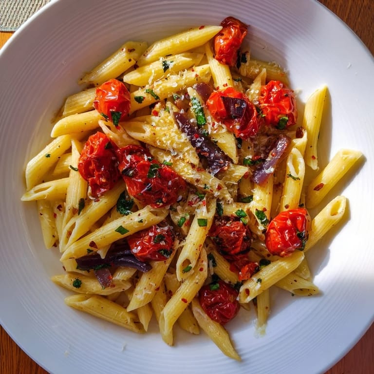 Save A vibrant, Mediterranean-inspired pasta dish featuring sweet roasted tomatoes, garlic, and fragrant olive oil, tossed with al dente pasta for a simple yet elegant meal.