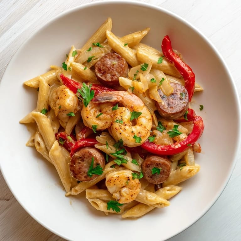 Save A creamy, spicy one-pan pasta featuring smoky sausage, succulent shrimp, and a rich Cajun Alfredo sauce—perfect for weeknight comfort.
