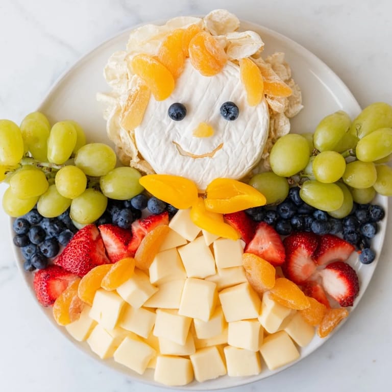 Start with the brie wheel as the face in the center, arrange grapes on each side to form wings, create the body with cheddar and Swiss cubes below, decorate with strawberries and blueberries, top with apricot hair, and add halo and eyes using bell pepper and olives or blueberries.