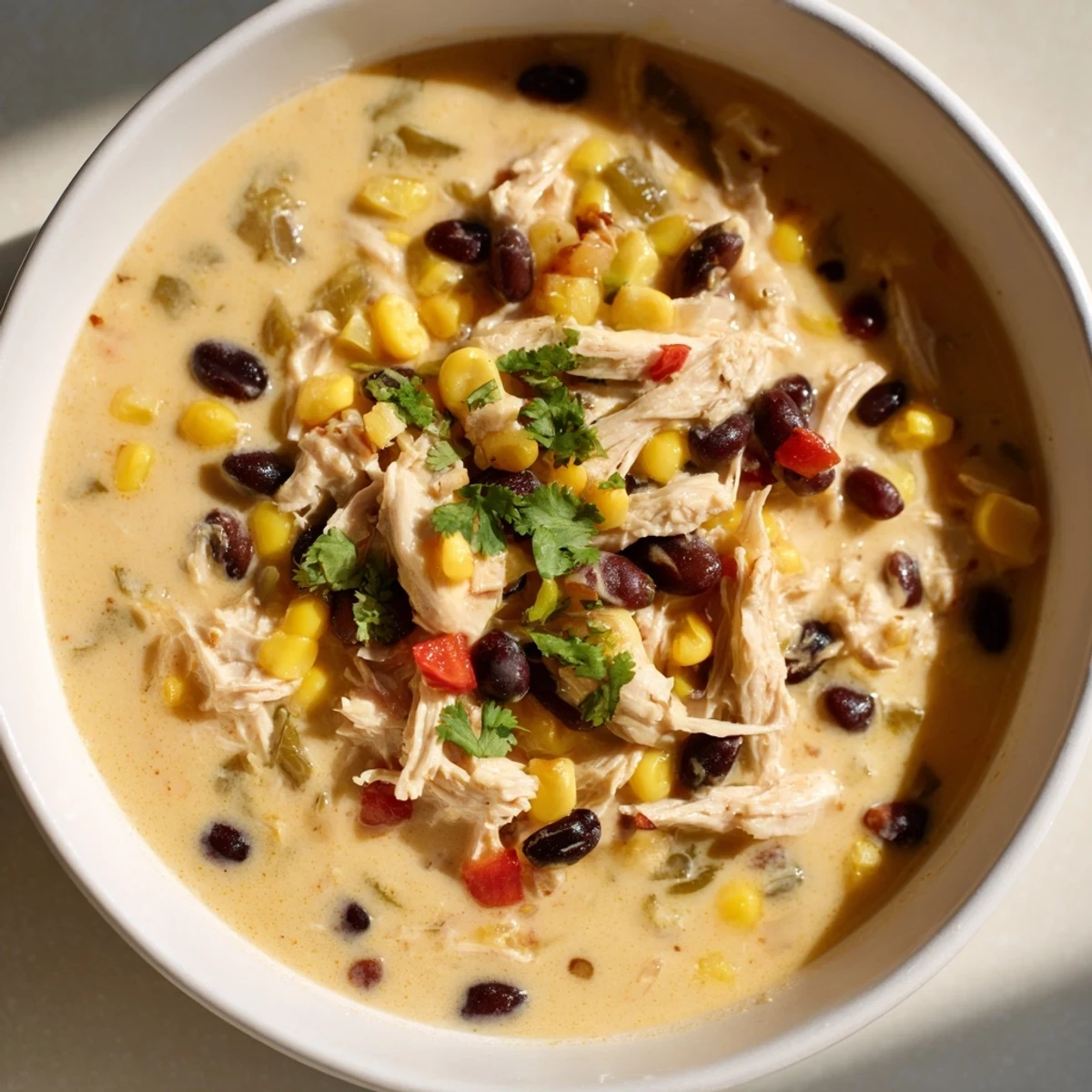 Save A creamy and comforting soup featuring shredded chicken, smoky poblano peppers, black beans, sweet corn, and a touch of lime—perfect for cozy dinners and quick weeknight meals.