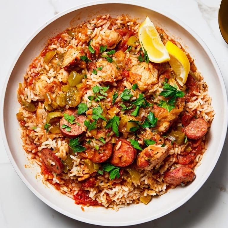 Save A hearty, oven-baked version of the classic Louisiana jambalaya, packed with tender chicken, smoky sausage, and aromatic vegetables in a flavorful tomato rice base.