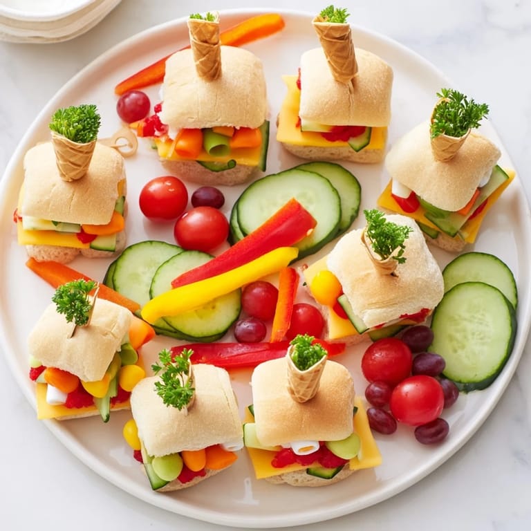 - Savory Components: 12 mini sandwich rolls (white and whole wheat), 8 cheese slices (mild cheddar, Swiss, or provolone), 8 deli-style vegetarian slices (or turkey/ham, as desired), 1 cucumber thinly sliced, 1 red bell pepper sliced into strips, 1 yellow bell pepper sliced into strips, 1 cup cherry tomatoes, 1 cup baby carrots