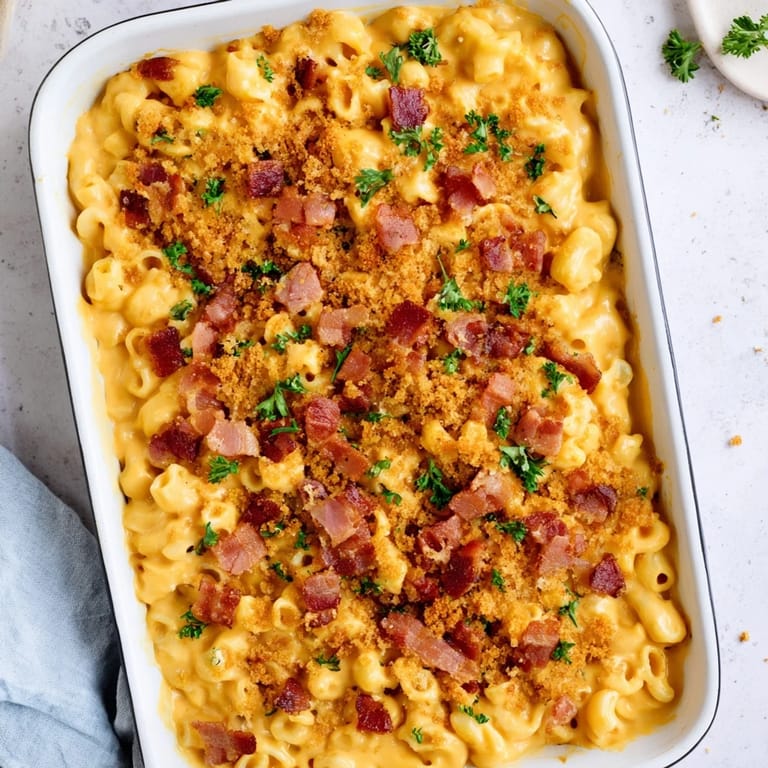 Save A comforting creamy mac and cheese baked on a sheet pan for maximum crispy edges topped with a savory bacon crumble for extra flavor and crunch.