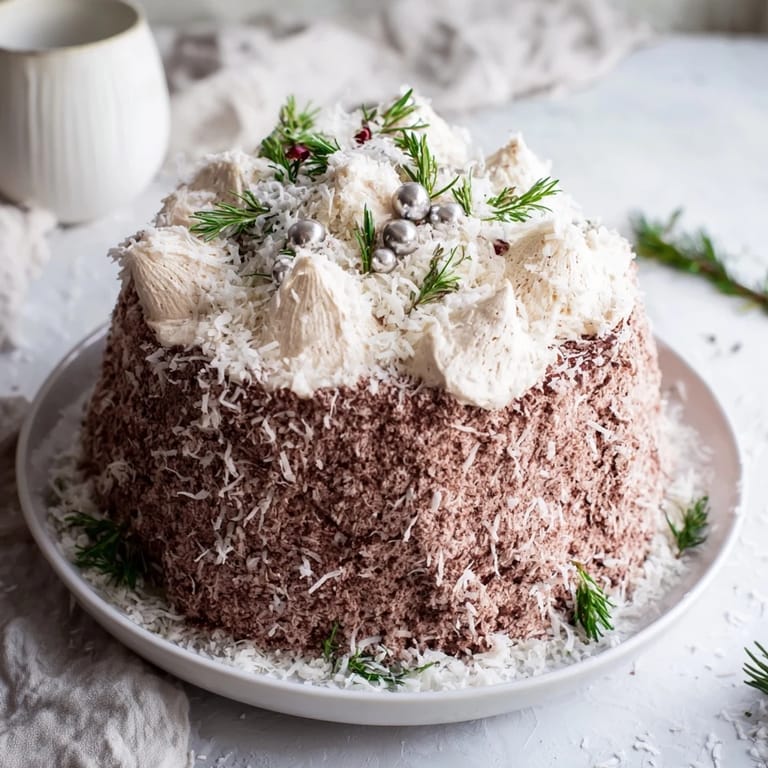 Shredded coconut flakes mimic freshly fallen snow, adding a decorative and textural element to the dessert.