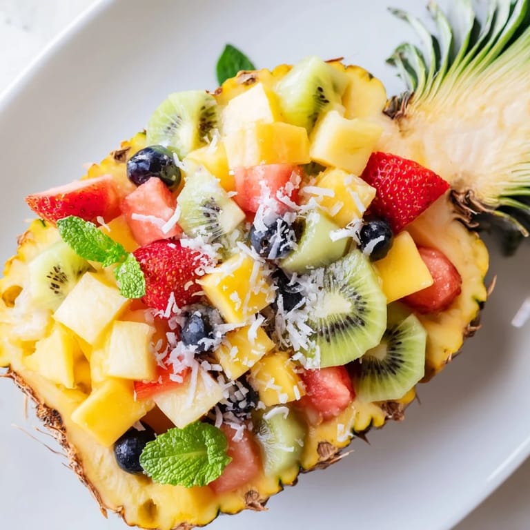Save A vibrant, refreshing fruit salad served in a pineapple shell, bursting with tropical flavors and perfect for summer gatherings.