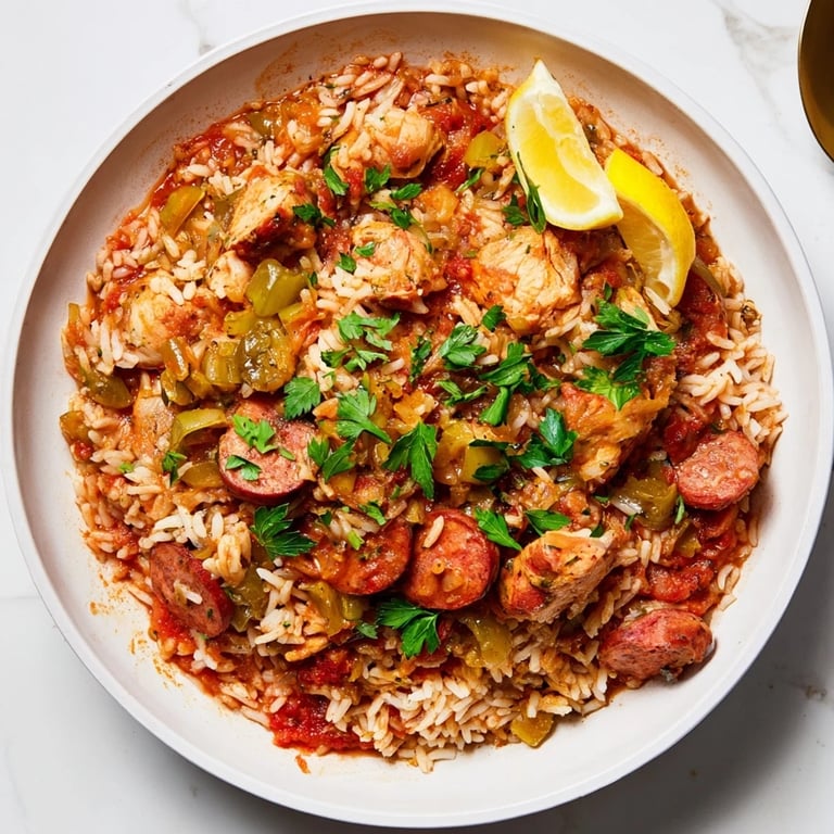 A hearty, oven-baked version of the classic Louisiana jambalaya, packed with tender chicken, smoky sausage, and aromatic vegetables in a flavorful tomato rice base.