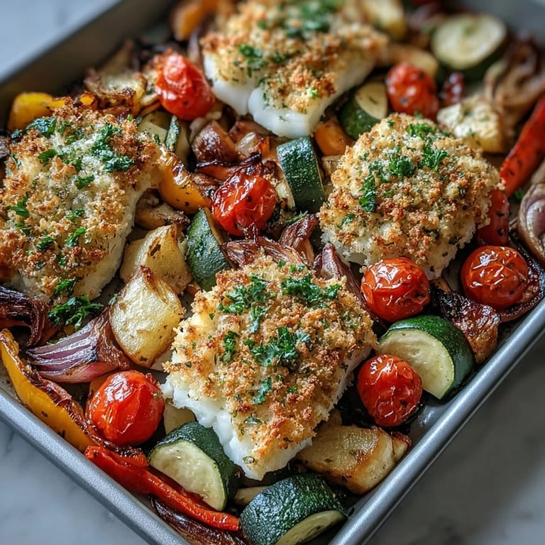 Save There's something almost magical about watching a sheet pan transform from scattered ingredients into a complete meal. I discovered this particular combination on a Tuesday evening when I had exactly one cod fillet left in the freezer and was tired of the usual roasted chicken routine. The smell of Parmesan crisping up in the oven while vegetables caramelize beside it created this golden, savory aroma that had my kitchen smelling like a Mediterranean bistro. My partner walked in mid-cook and immediately asked what smelled so good, which told me everything I needed to know about how this dish would turn out.
