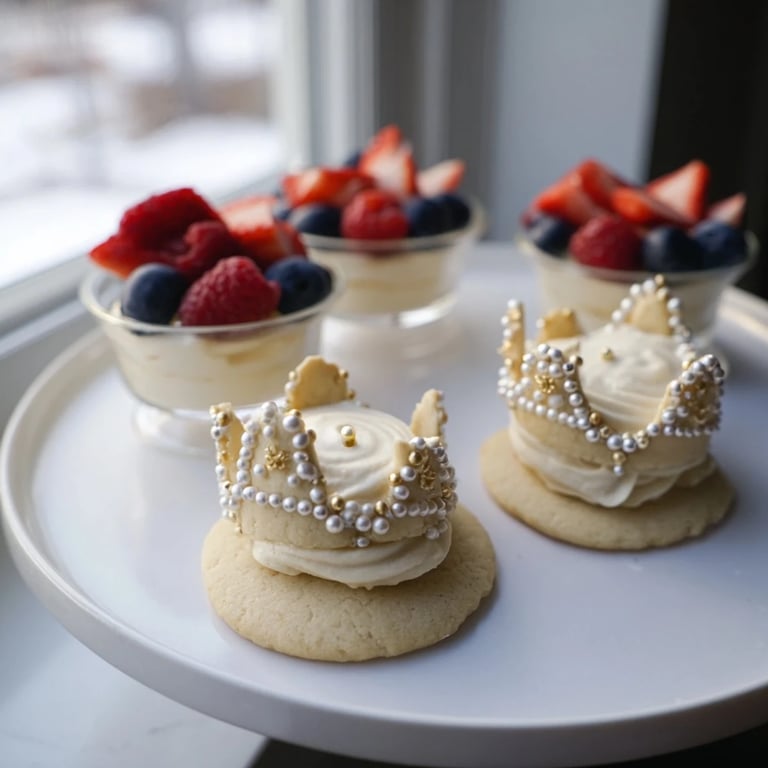 Save A whimsical, royal-inspired dessert tray featuring crown-shaped sugar cookies, berry jewels, and creamy white chocolate mousse. Perfect for birthdays, princess parties, or any magical celebration.